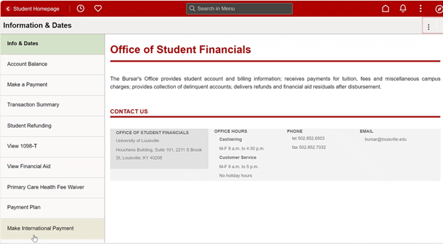 The Bursar's Office provides student account and billing information; receives payments for tuition, fees and miscellaneous campus charges; provides collection of delinquent accounts; delivers refunds and financial aid residuals after disbursement.