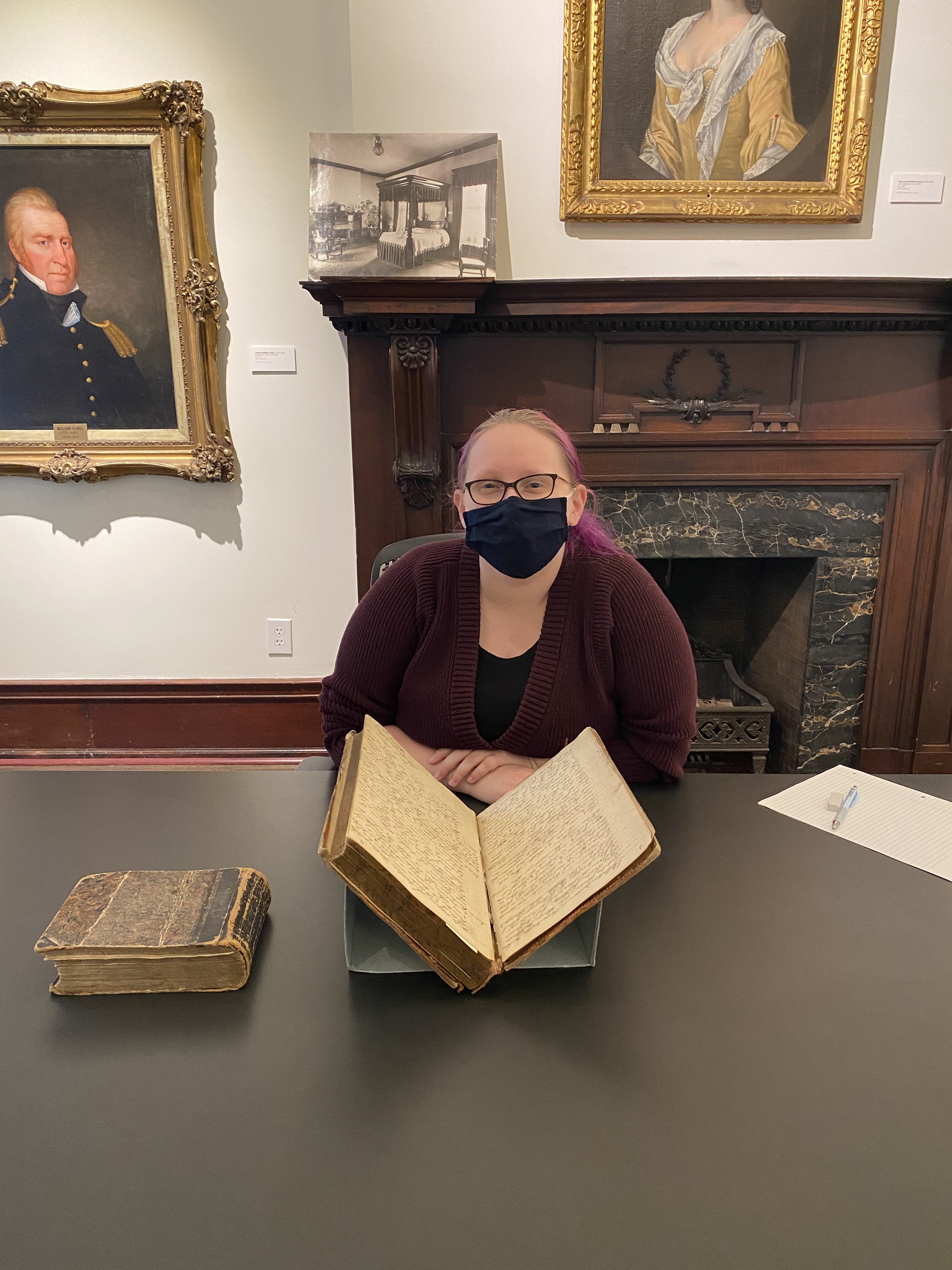 | Chelsea Giovacchino is a graduate student pursuing her MA in Interdisciplinary Humanities. This semester, she is doing a research internship at Filson Historical Society “Mapping Jewish Louisville.” She is pictured here with a Filson member's meeting log from 1860-1870 for a Louisville Jewish Lodge called the B'nai B'rith. Her site supervisor is Dr. Abby Glogower, Curator of Jewish Collections at the Filson Historical Society | |