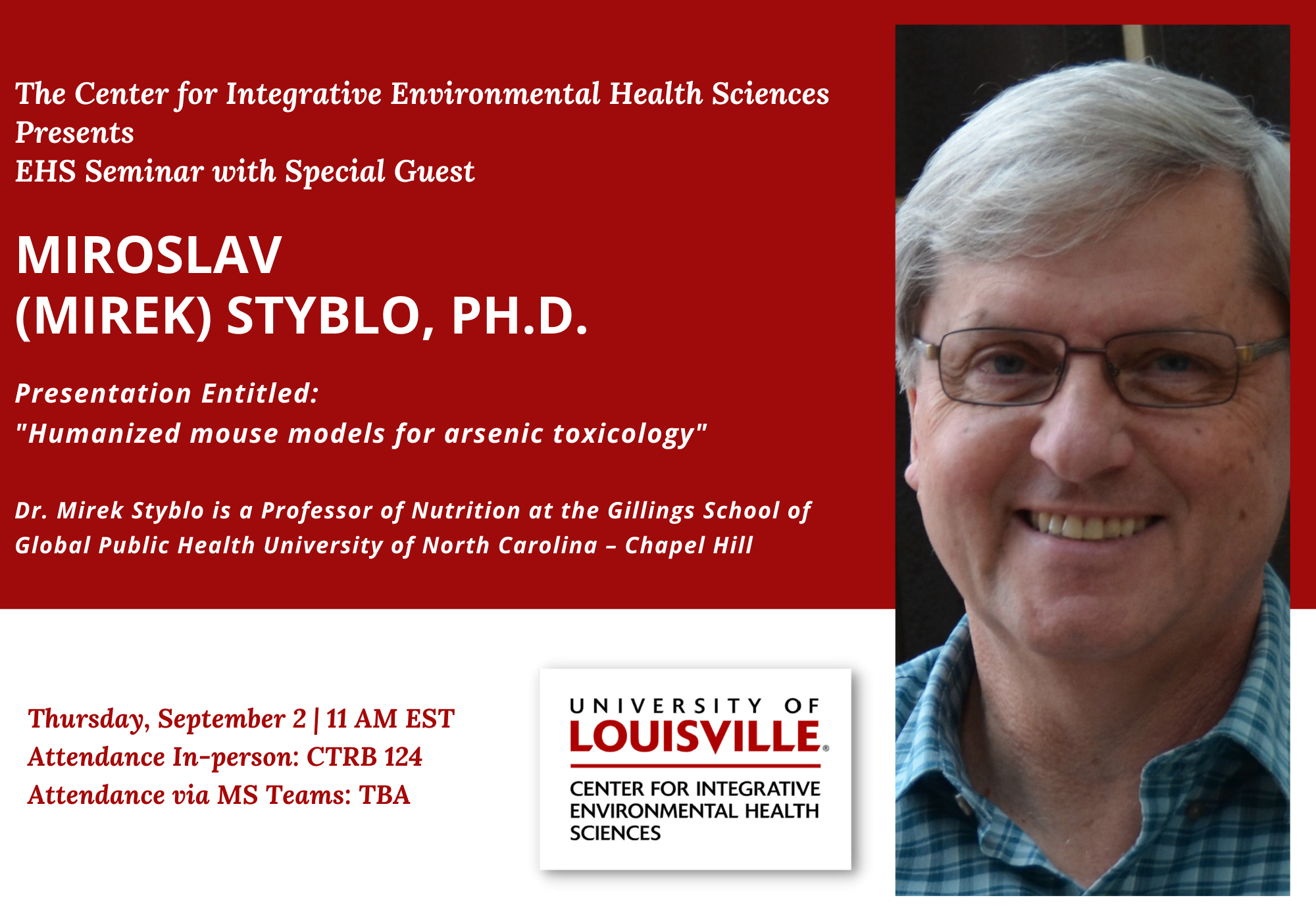 This is a poster for Miroslav (Mirek) Styblo, Ph.D.'s seminar on September 2, 2021