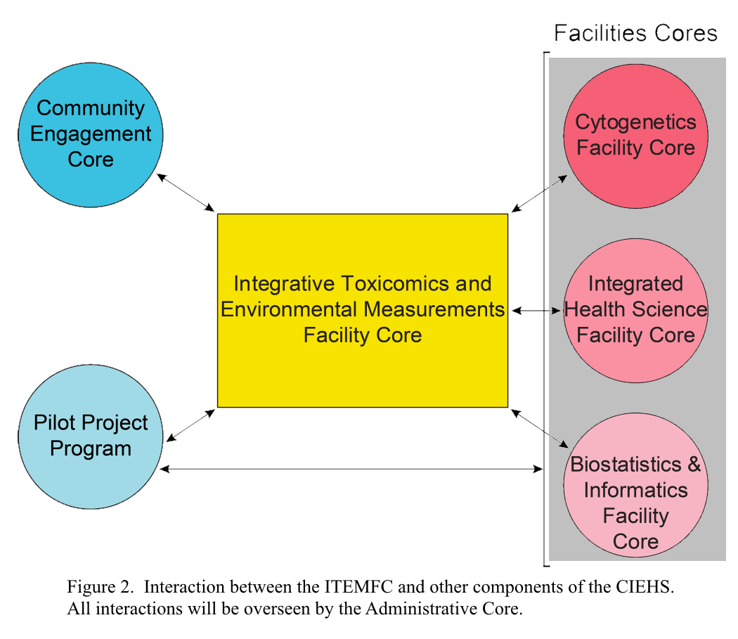 This image shows the interaction between the ITEMFC and other components of the CIEHS. All interactions will be overseen by the Administrative Core.
