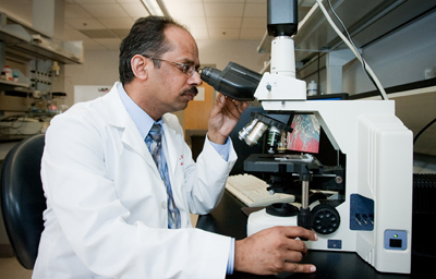 Dr. Sanjay Srivastava at microscope in laboratory