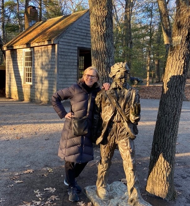 Amy at Walden Pond, Massachusetts, next to Thoreau statue