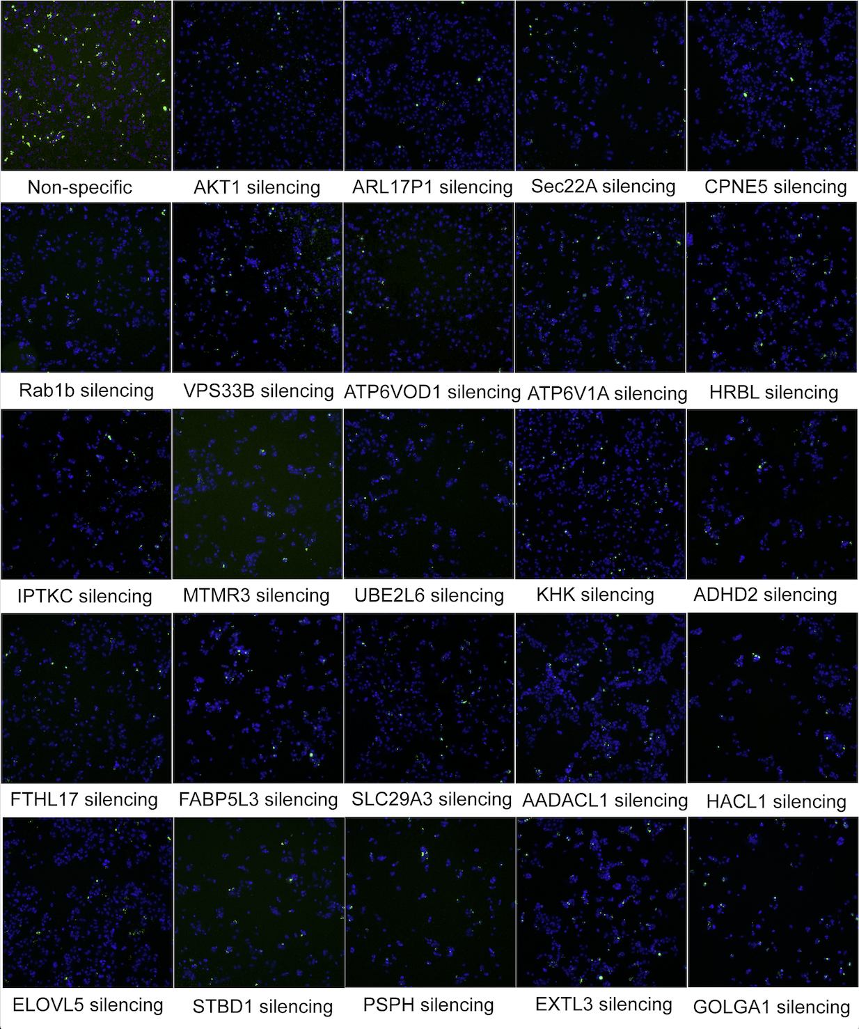 Raw data from the global RNAi screen. Host cells are in blue, Salmonella is green. Upper left is a non-silencing control. Akt1 is a positive control.