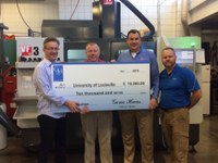 The Vogt Engineering staff received a Gene Haas Foundation post-secondary award grant check for $10,000.00 from local Haas HFO Midwest Salesman, Phil Haming. Vogt Engineering plans to use the funds for advancement and development of CNC manufacturing technologies in association with their operations of the Rapid Prototyping Center and Additive Manufacturing Competency Center located at J B Speed School of Engineering at the University of Louisville.