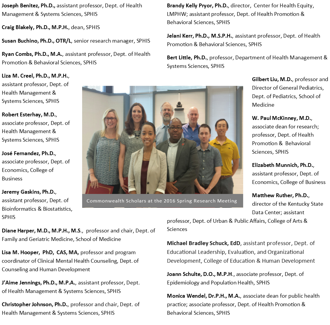 Joseph Benitez, Ph.D., assistant professor, Dept. of Health Management & Systems Sciences, SPHISCraig Blakely, Ph.D., M.P.H., dean, SPHISSusan Buchino, Ph.D., OTR/L, senior research manager, SPHISRyan Combs, Ph.D., M.A., assistant professor, Dept. of Health Promotion & Behavioral Sciences, SPHISLiza M. Creel, Ph.D., M.P.H., assistant professor, Dept. of Health Management & Systems Sciences, SPHISRobert Esterhay, M.D., associate professor, Dept. of Health Management & Systems Sciences, SPHISJosé Fernandez, Ph.D., associate professor, Dept. of Economics, College of BusinessJeremy Gaskins, Ph.D., assistant professor, Dept. of Bioinformatics & Biostatistics, SPHISDiane Harper, M.D., M.P.H., M.S., professor and chair, Dept. of Family and Geriatric Medicine, School of MedicineLisa M. Hooper, PhD, CAS, MA, professor and program coordinator of Clinical Mental Health Counseling, Dept. of Counseling and Human DevelopmentJ’Aime Jennings, Ph.D., M.P.A., assistant professor, Dept. of Health Management & Systems Sciences, SPHISChristopher Johnson, Ph.D., professor and chair, Dept. of Health Management & Systems Sciences, SPHISBrandy Kelly Pryor, Ph.D., director, Center for Health Equity, LMPHW; assistant professor, Dept. of Health Promotion & Behavioral Sciences, SPHISJelani Kerr, Ph.D., M.S.P.H., assistant professor, Dept. of Health Promotion & Behavioral Sciences, SPHISBert Little, Ph.D., professor, Department of Health Management & Systems Sciences, SPHISGilbert Liu, M.D., professor and Director of General Pediatrics, Dept. of Pediatrics, School of MedicineW. Paul McKinney, M.D., associate dean for research; professor, Dept. of Health Promotion & Behavioral Sciences, SPHISElizabeth Munnich, Ph.D., assistant professor, Dept. of Economics, College of BusinessMatthew Ruther, Ph.D., director of the Kentucky State Data Center; assistant professor, Dept. of Urban & Public Affairs, College of Arts & SciencesMichael Bradley Schuck, EdD, assistant professor, Dept. of Educational Leadership, Evaluation, and Organizational Development, College of Education & Human DevelopmentJoann Schulte, D.O., M.P.H., associate professor, Dept. of Epidemiology and Population Health, SPHISMonica Wendel, Dr.P.H., M.A., associate dean for public health practice; associate professor, Dept. of Health Promotion & Behavioral Sciences, SPHIS