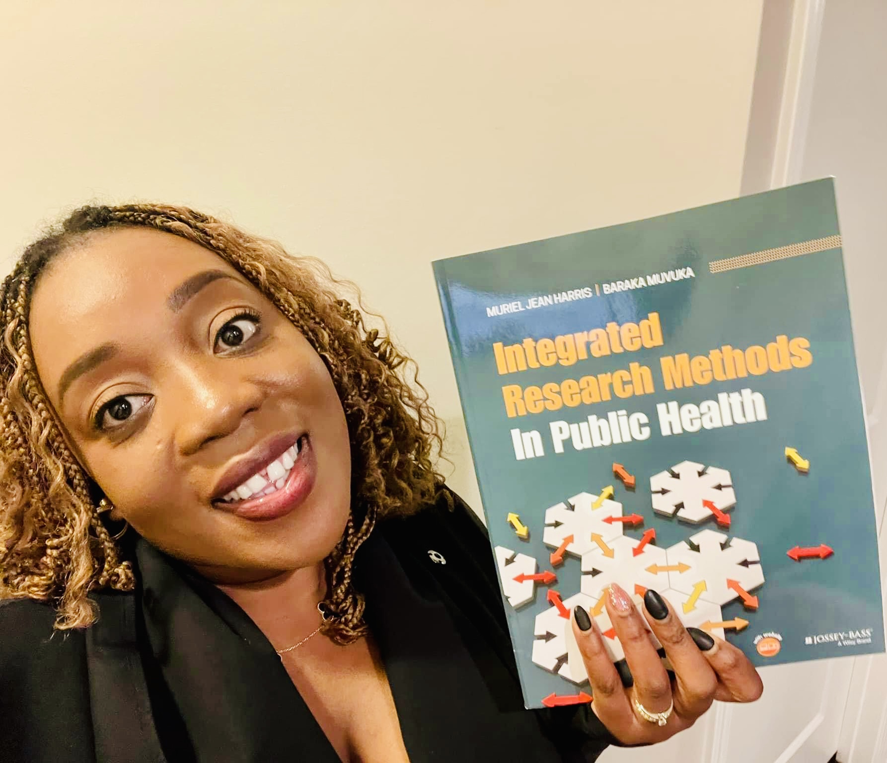 Baraka Muvaka holding copy of book she coauthored, "Integrated Research Methods In Public Health"